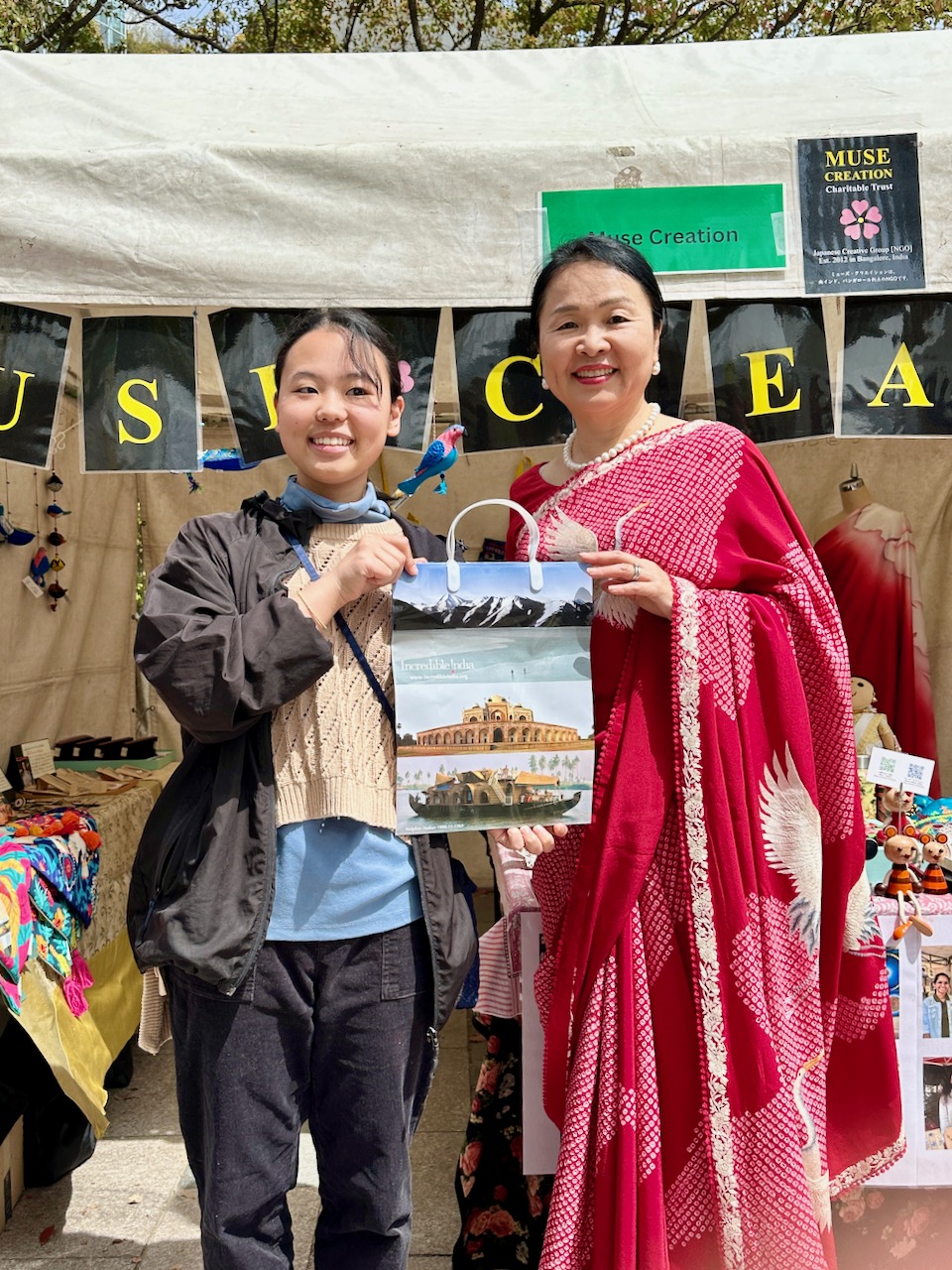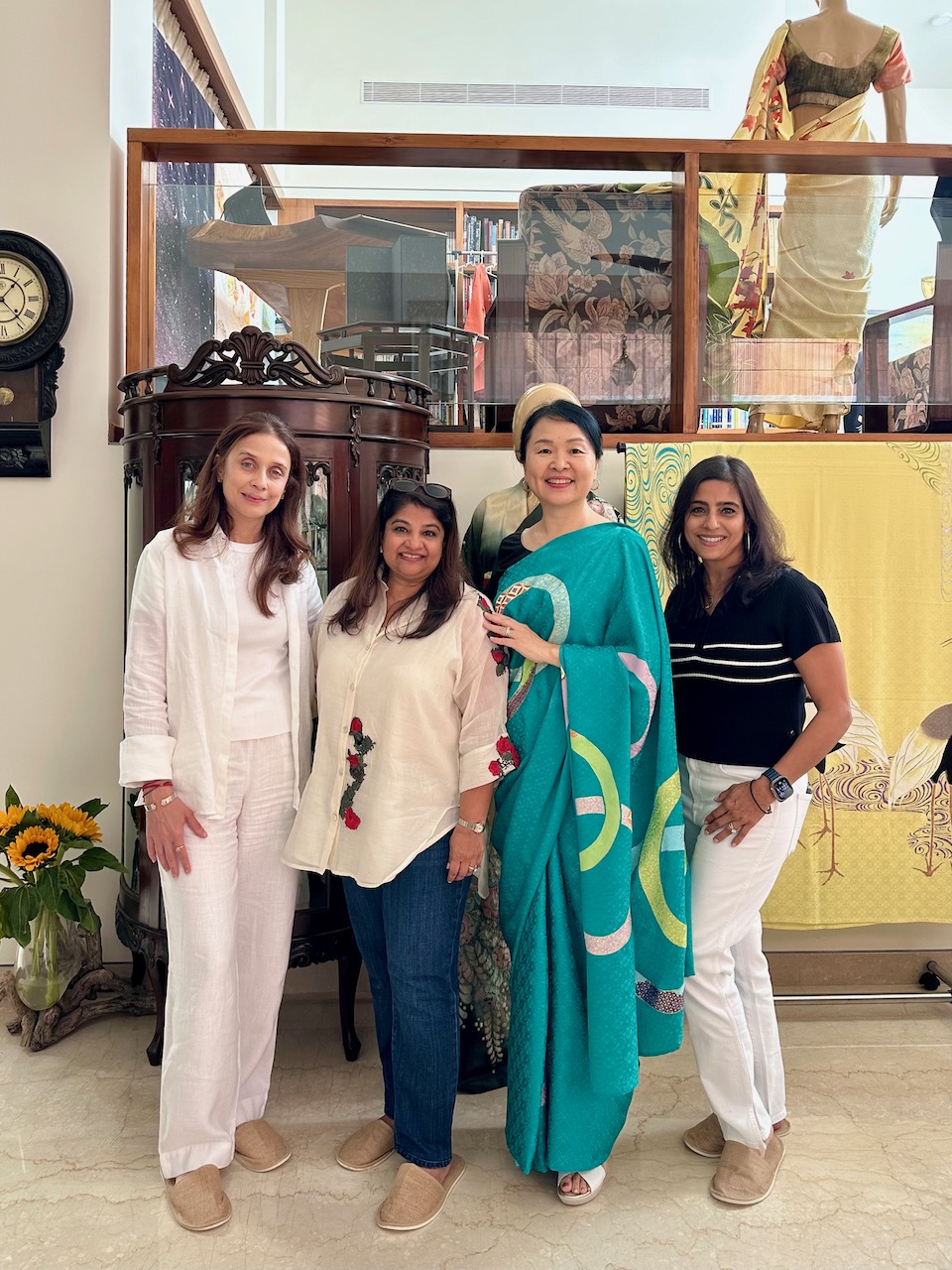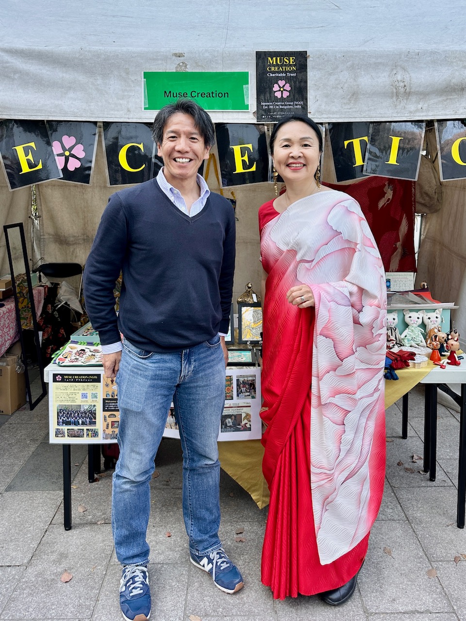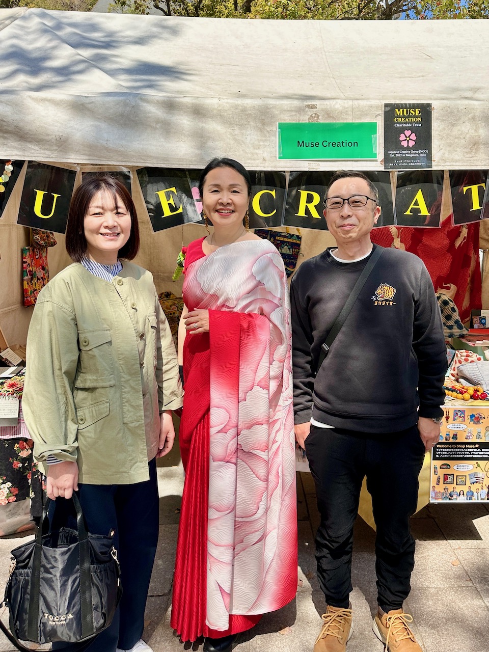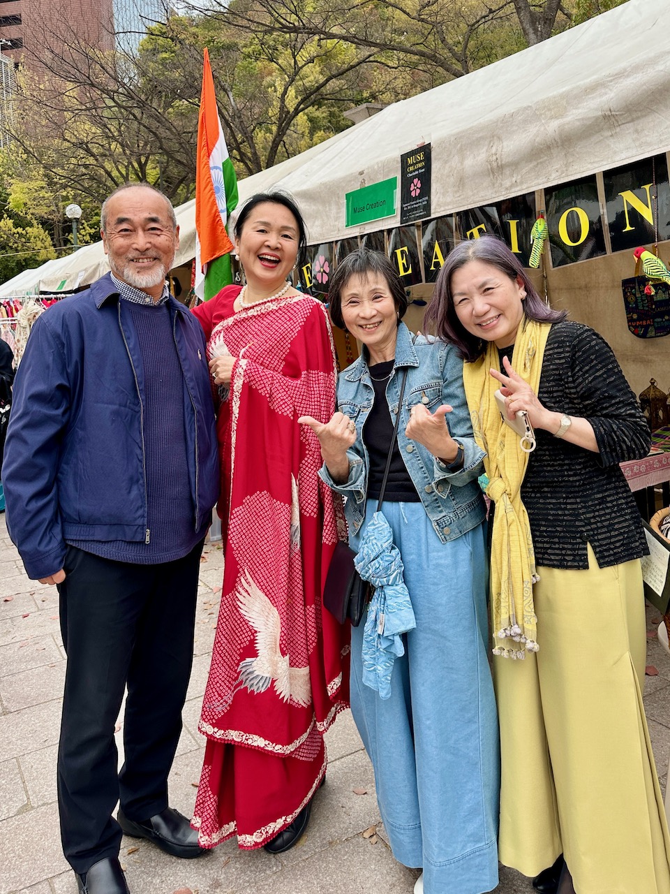 昨年、わたしが急遽、コーディネートすることになったJWマリオットホテルでの着物ファッション・ショーに、中根総領事も参席されていた。その流れで、今年の天皇誕生日式典では、京友禅サリーの展示をさせていただく運びとなった。