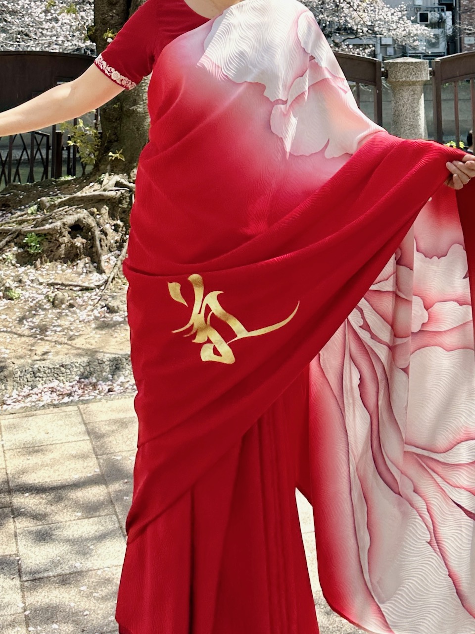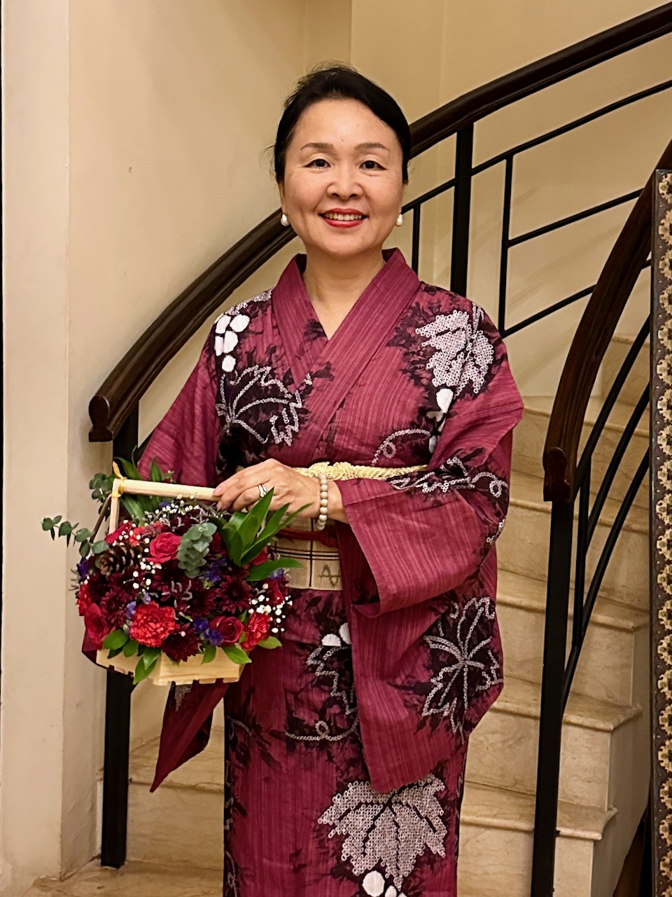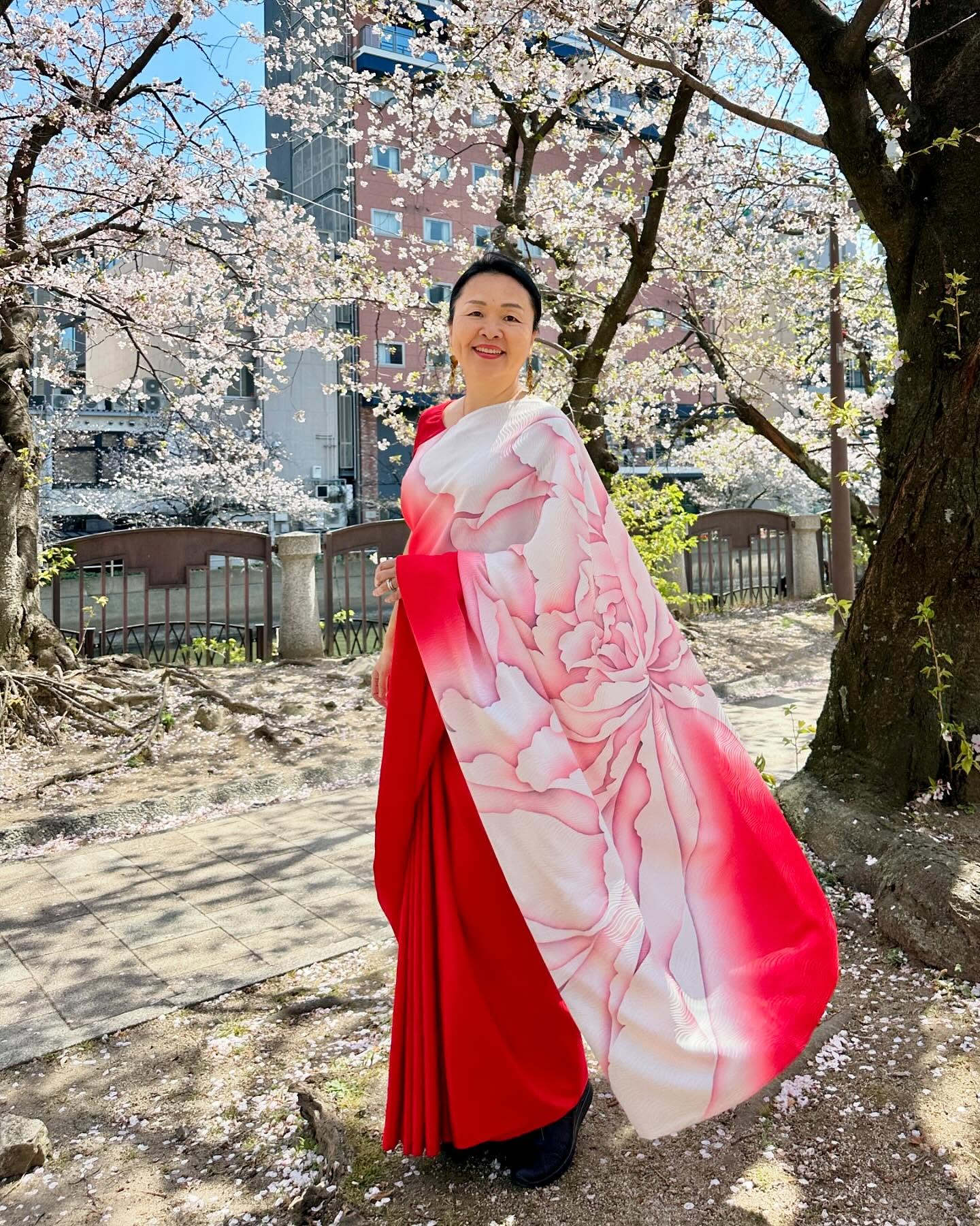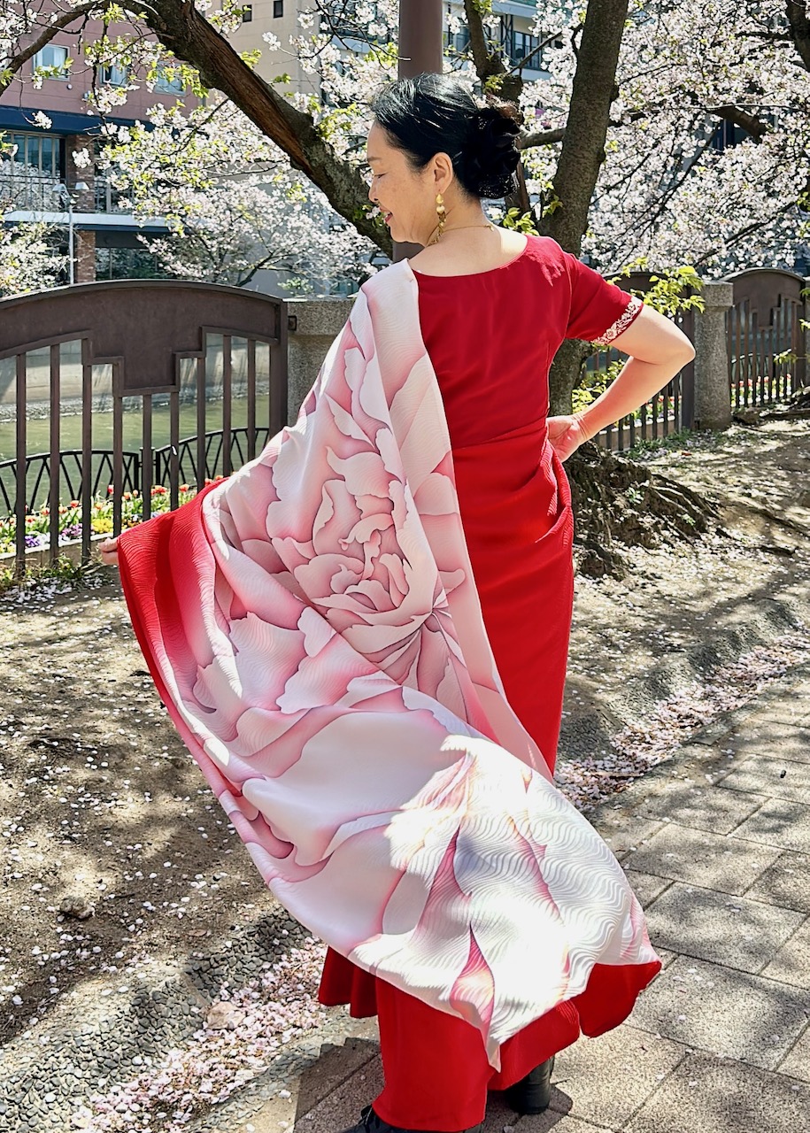 先日、在ベンガルール日本国総領事館の中根総領事から晩餐のお招きを受けて、我々夫婦は総領事公邸へお伺いした。わたしは、先日の一時帰国時、自分のために購入し、「ナマステ福岡」でも着用した赤い京友禅サリーを選んだ。日本の色合いだな……と改めて思う。