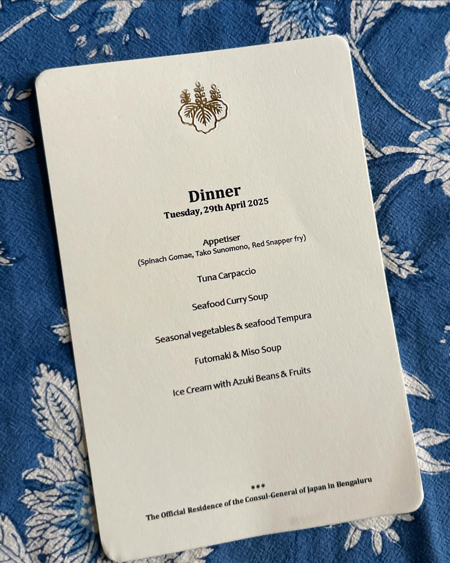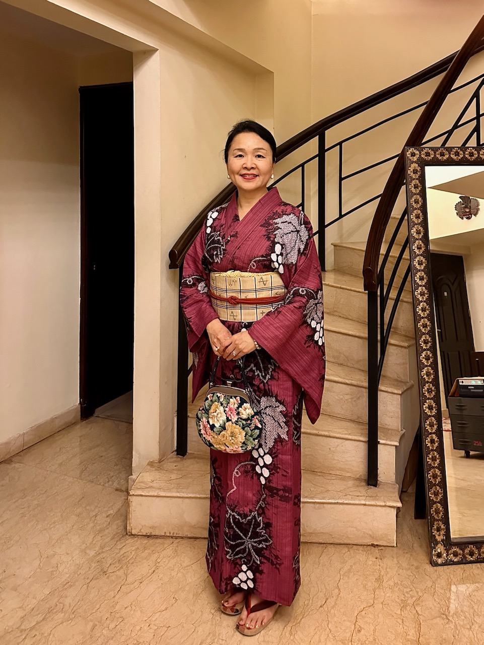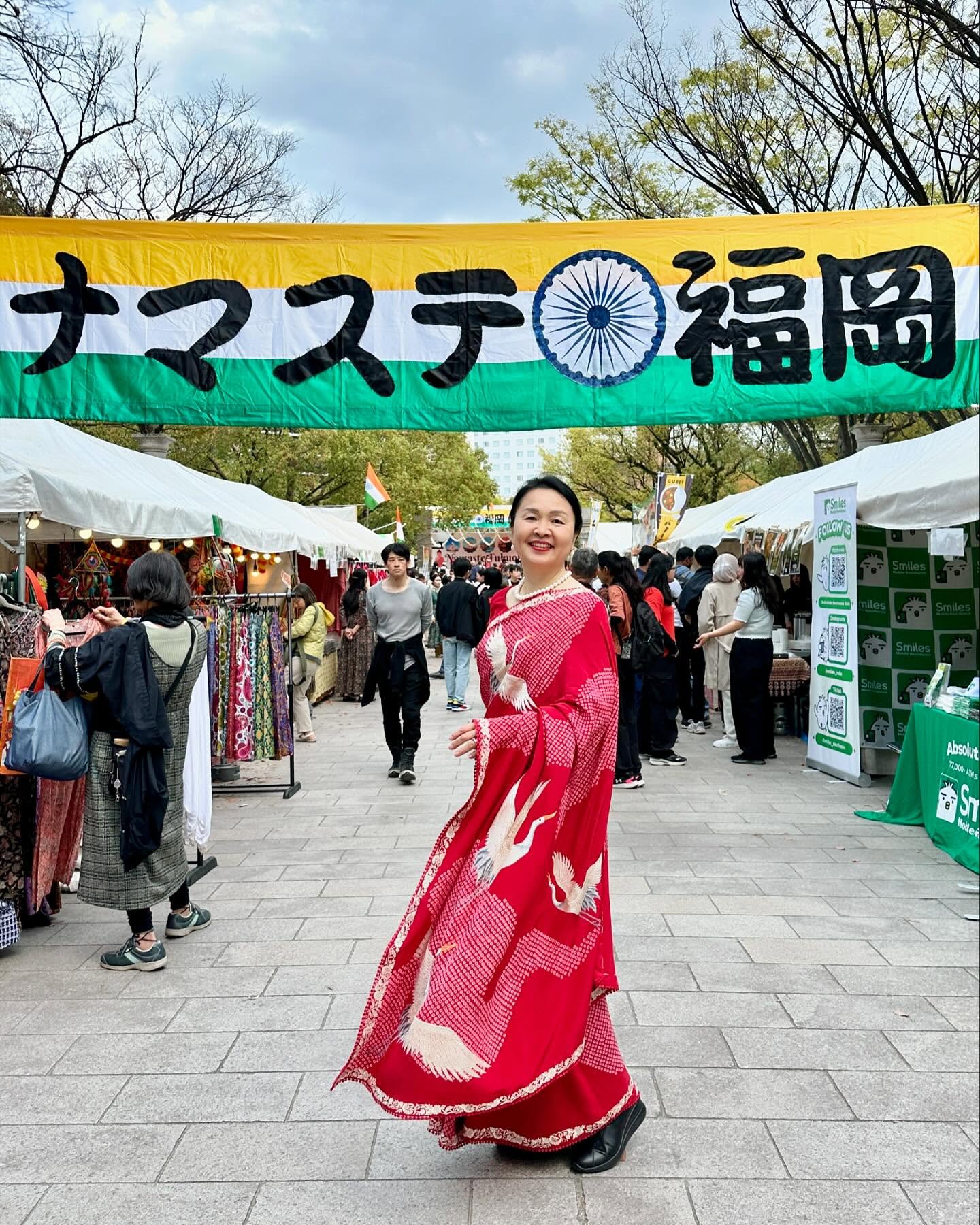 先日、在ベンガルール日本国総領事館の中根総領事から晩餐のお招きを受けて、我々夫婦は総領事公邸へお伺いした。わたしは、先日の一時帰国時、自分のために購入し、「ナマステ福岡」でも着用した赤い京友禅サリーを選んだ。日本の色合いだな……と改めて思う。