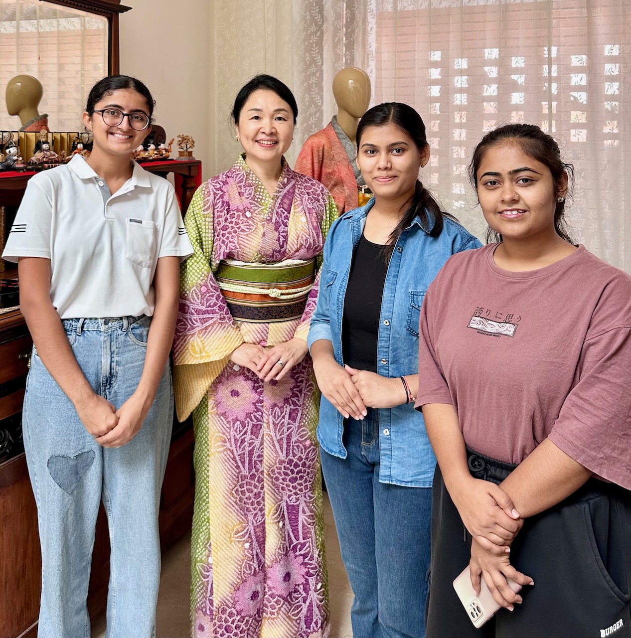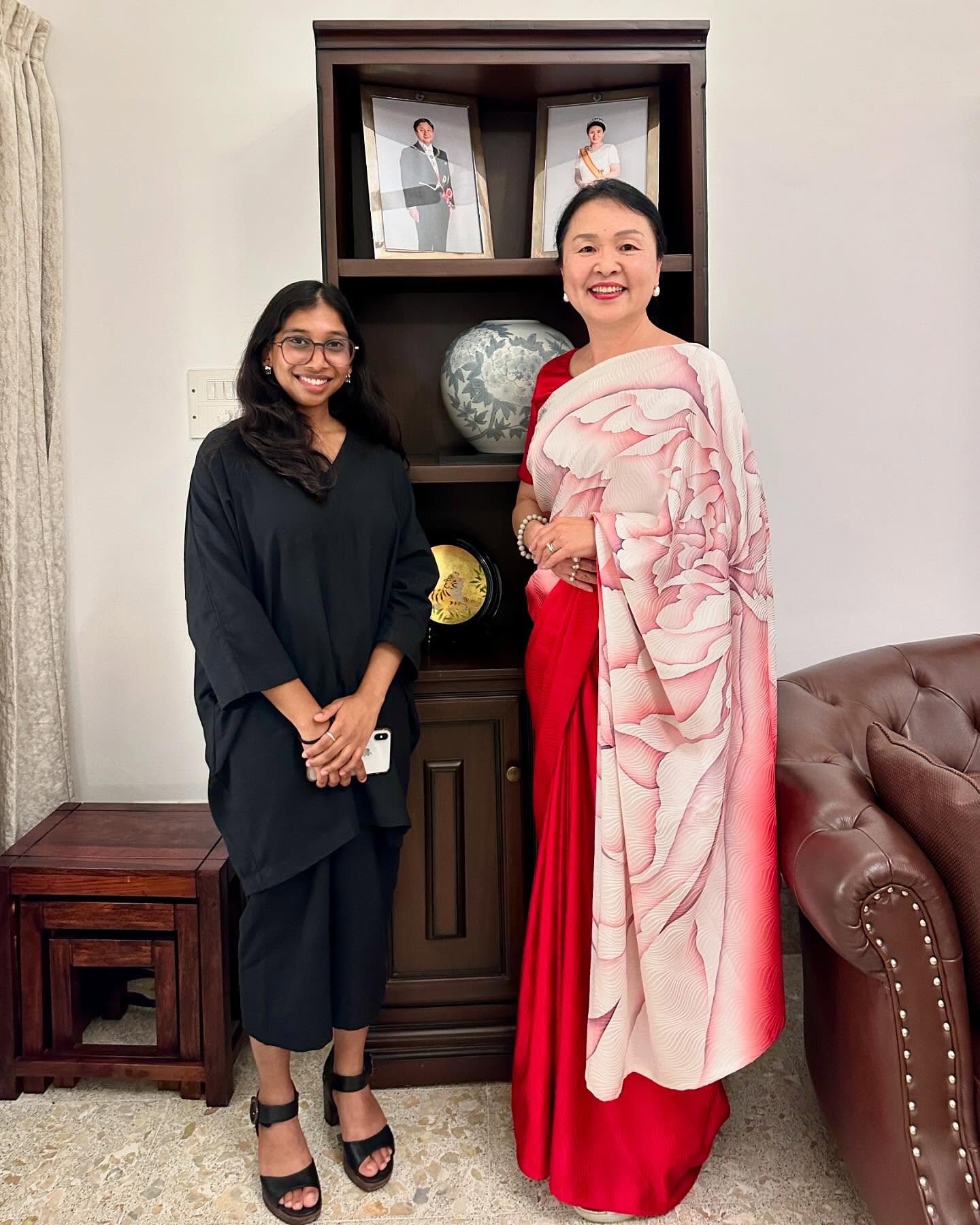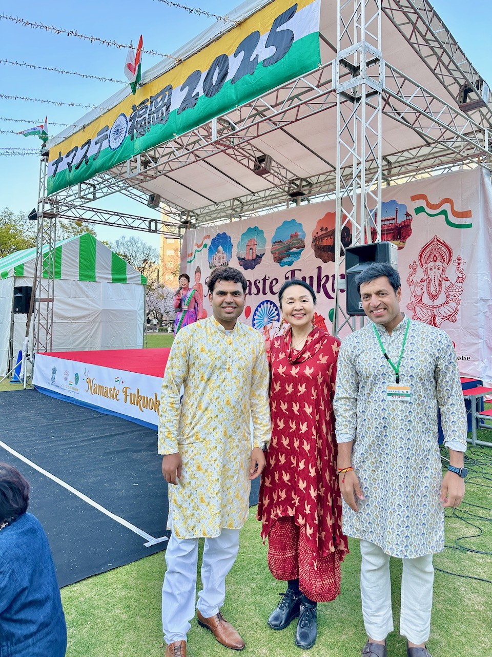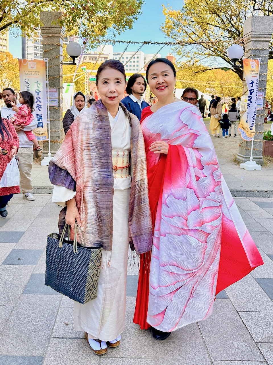 先日、在ベンガルール日本国総領事館の中根総領事から晩餐のお招きを受けて、我々夫婦は総領事公邸へお伺いした。わたしは、先日の一時帰国時、自分のために購入し、「ナマステ福岡」でも着用した赤い京友禅サリーを選んだ。日本の色合いだな……と改めて思う。