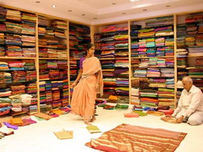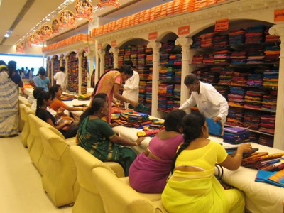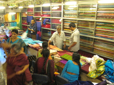 以前、チェンナイ出張の折に立ち寄ったサリー専門店。チェンナイはデリーやムンバイ、バンガロールなどの都市に比べると比較的コンサバティヴで、サリーを着た女性を多く見かけます。ヘアスタイルも昔ながらのロングに三つ編み、激しく豊満な女性が多いのも特長です。