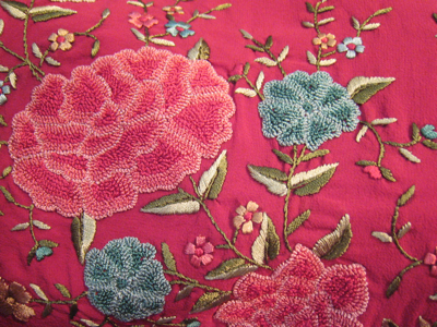 上の繊細な刺繍。これはコルカタ(カルカッタ)製のサリーで、シフォン地に「フレンチ・ノット (French knot) 」と呼ばれる技法で刺繍が施されています。テキスタイル王国インドでは、このような手工芸品が健在で、折に触れ見事な職人技を目にすることができます。