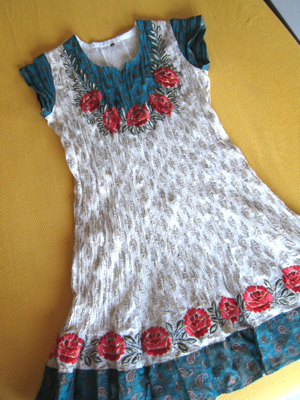 下の写真は、サルワール・カミーズのマテリアル。こちらもすべて、手刺繍です。このマテリアルをテイラーに持って行き、自分のサイズに合わせて縫製してもらいます。インドではこのようなテイラーメイドが一般的で、自分にぴったりの服を気軽に作れるのが魅力です。