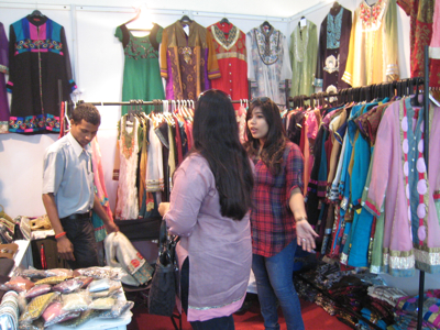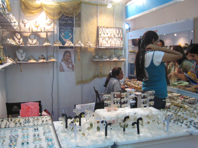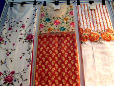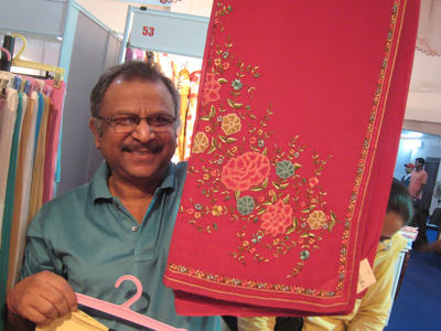 こちらは、コルカタで刺繍製品を製造販売している店のブース。この店の刺繍のクオリティはかなり高く、サリーやサルワール・カミーズ(トップとボトム、スカーフの3点セット)のマテリアルなどがカラフルに展示されています。