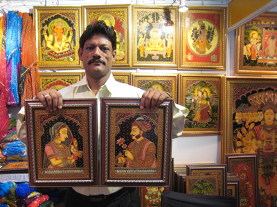 ヒンドゥー教の神々や、古(いにしえ)のマハラジャ、マラハニなどをモチーフとしたきらびやかな作品。アーティストから直接、絵の描き方などを尋ねるのは、とても興味深いものです。