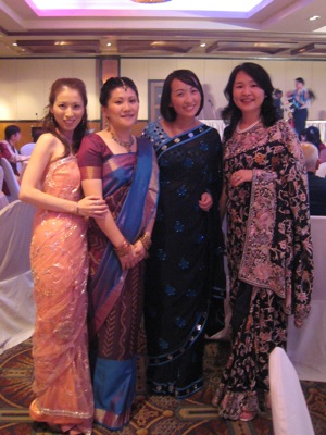 サリーを来て参加される人たちも多く、ジュエリーもきらびやかに、華やか、賑やかです。メイドに着付けをしてもらう人、ビューティーサロンでヘアメイクと着付けをしてもらう人など、みなそれぞれに苦心しながらも、おしゃれを楽しんでいるようです。