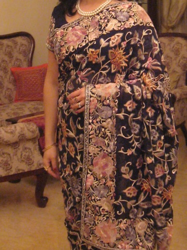 ところで今日、わたしが着ているのは、ムンバイで先日購入したパルシー (PARSI) の伝統刺繍のサリー。パルシーとは、ムンバイに居住者の多い、ペルシャ(現イラン)出自の人々で、ムンバイではこの「パルシー・ワーク」というサリーが比較的多く見られます。