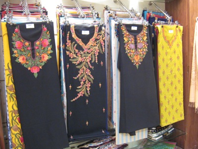 たとえば上の写真。これはクルティと呼ばれるトップ。チュニックのようなものですが、このようなトップも、好みのデザインに仕上げてもらうことができます。この布は、カシミール地方の刺繍が施されたもの。