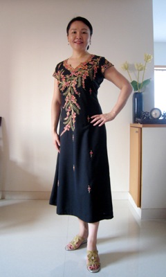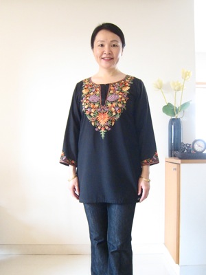 ボトムは当面必要ないので、取り敢えずトップだけを作りました。生地は木綿で、手刺繍が施されています。値段はデザインによりますが2500円〜4000円程度。仕立て代を含めても5000円以内です。ちなみに「手刺繍」などに拘らなければ、ぐ〜んと安く作ることができます。
