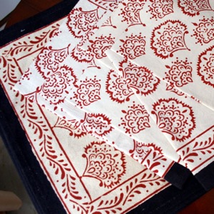 木材を彫ってスタンプにしたもので模様を描く「ハンドブロック・プリンティング」により作られたプレースマット。インドでは、ナプキンとともに6枚ずつのセットになっているのが一般的ですが、この店では1枚ずつ購入できます。