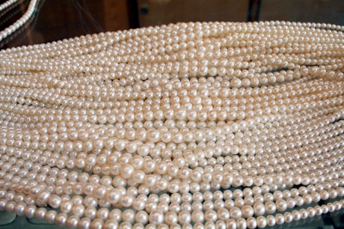 店では、真珠が無造作に、ジャラジャラと置かれています。品質はピンからキリまで。これらは、「そこそこ」の品質のようですが、それにしてもこの扱い。ダイナミックというか、雑です。