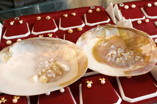 これらは真珠貝。一つの貝からは、大小さまざまな、形もばらつきのある真珠が40個ほどとれるそうです。そう聞くと、形が悪いものが安いというのは納得できるのですが、