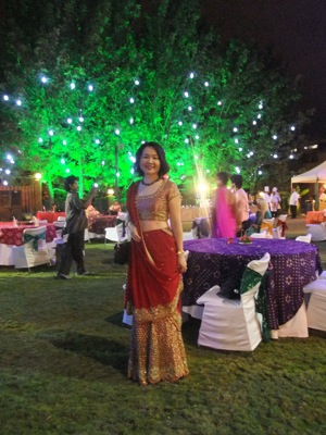と尋ねたら、赤がいいというので、レンガ・チョリを着用することにした。レンガ・チョリとは、サリーとは異なる、ブラウスと長いスカート、そしてスカーフの3点セットのドレスである。