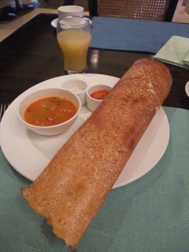 果物とクロワッサンにとどめておくべきなのでしょうが、ついつい頼んでしまったおなじみのドサ。米粉と豆粉を発酵させた生地を、パリッと香ばしく焼いた南インドの朝食です。