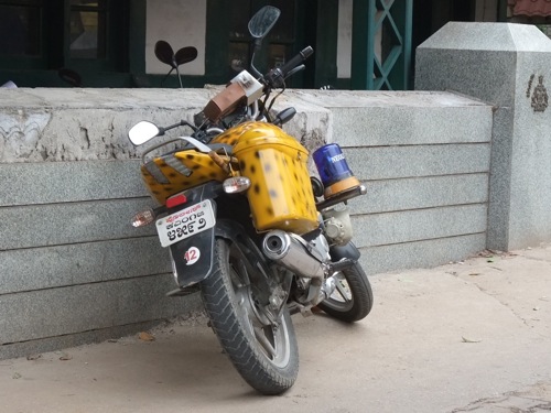 ついに激写! である。残念ながら日陰だったため、色合いが不鮮明なのが惜しいが、ともあれうれしい。このお兄さん。バンガロールのポリスマンだ。そしてこのアニマルプリント。ヒョウ柄のバイクは、ポリス用バイクである。