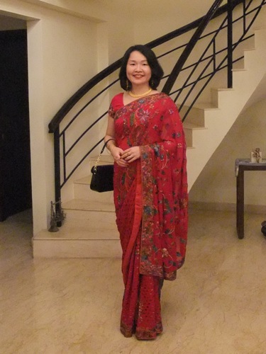 このサリーは、着用している本人は別として、近くで見る方がより美しい。
