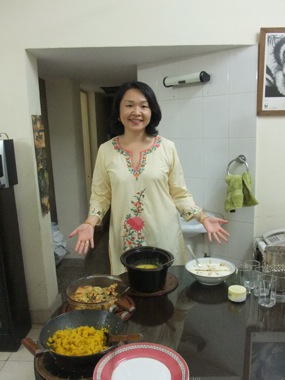 わたくしの手料理です! と言いたいところだが、スジャータ作の美味インド料理だ。特にカボチャの煮込みがおいしかった。びっくりするほど甘いのだ。和カボチャほどほくほくとはしていないが、インドものにしては美味。