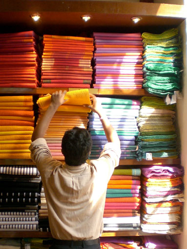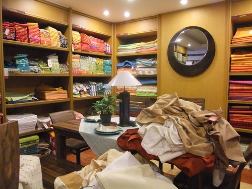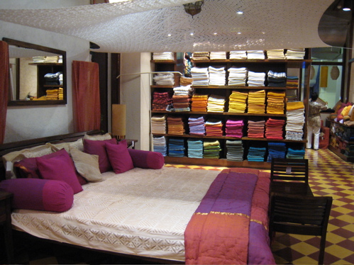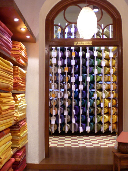 ニューデリーの本店(Greater Kailash)へ初めて足を運んだときには、その色とりどりの布製品を前に、圧倒されたものです。