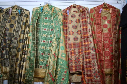 シルク製のサルワールカミーズ用布地。もちろん手織りです。テイラーに持っていけば、自分の好きなように仕立ててもらえます。前回断念した赤い花柄に、やはり引かれます。