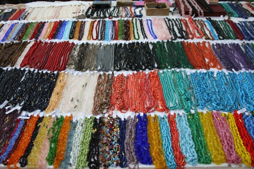 ジャラジャラとカラフルな天然石のネックレスが並んでいます。インドでは露店などでもよく見かける光景です。