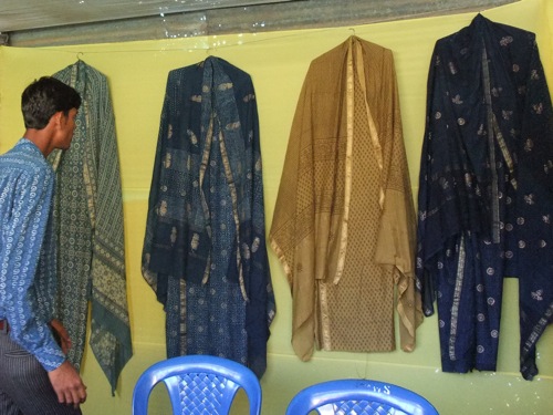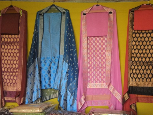 壁に掛けてあるものは、たいていサルワール・カミーズのマテリアル。クルタ(トップ)用の布にデュパタがかけられています。