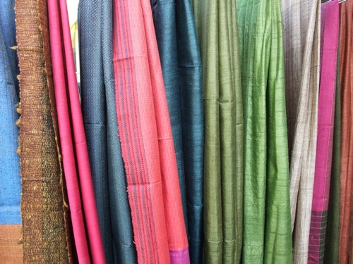 手紡ぎの絹糸で織られたロウシルク。触感は粗いものもあり、肌触りはあまりよくないのですが、しかし見た目の風合いがよく、インドでは非常に一般的な素材。