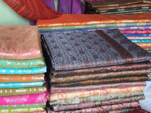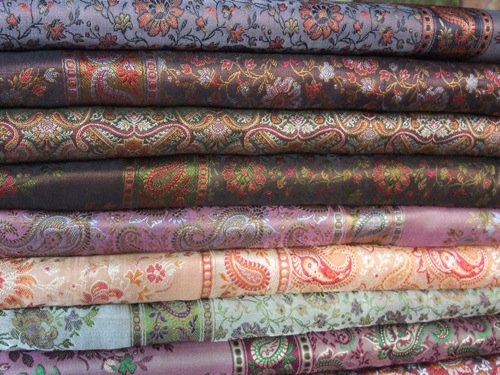 ヴァラナシ・シルクでよく見かけるペイズリー柄などの布。これらは色合いが落ち着いていて、光沢、質感ともに高級感が漂います。