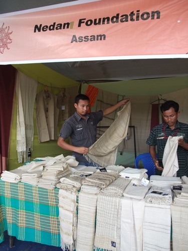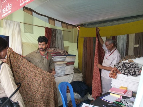 さてさて今日も、インド各地からの手工芸品が結集しています。NATURE BAZAARと言うだけあって、手織りや手染めの、しかも自然の素材を用いた「ナチュラルな商品」が中心です。