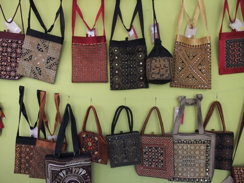 会場に入るなり、ポップなテキスタイルに出迎えられます。一番上の写真がそれ。このDASTKARオリジナルの商品、個性的なデザインのバッグがユニークで、実はムンバイのクラフトフェアでも「お買い物バッグ」を購入していたのでした。