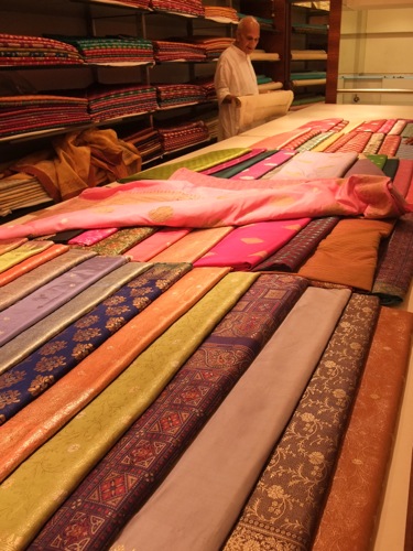 先日ネイチャー・バザールで見つけたバラナシ・シルクのサリーと比べたく、まずはバラナシ・シルクを見せてもらいます。