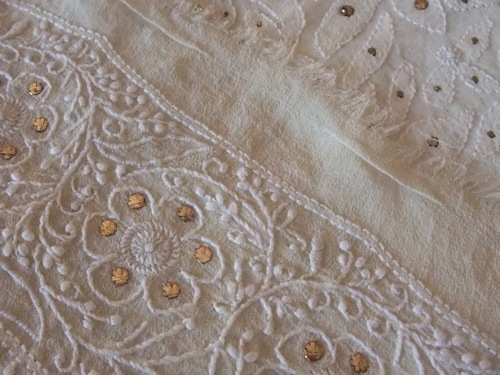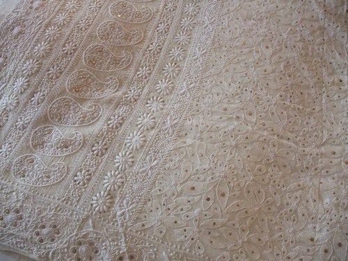 一目見るなり、惚れました。これはインドでもよく見るラクナウのチカンカリ刺繍。しかし、すでにサリーや衣類として形になっている物が大半、マテリアルは限られた専門店でしか見られません。