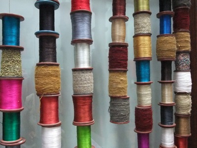 女性デザイナーのジュリーによる、インドの伝統的な手法を生かした、しかし斬新なデザインのサリーなど衣類や小物が置かれています。