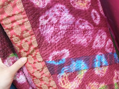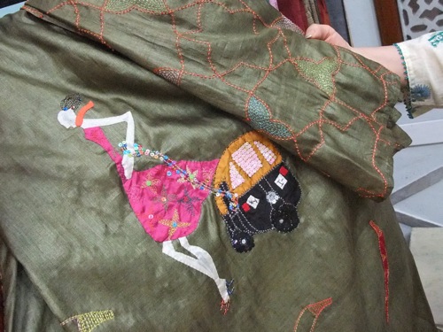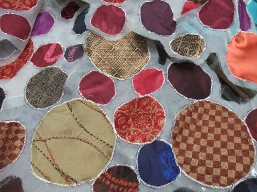サリーなどに使う布の端切れを集めて丸く切り、シフォンシルクに縫い付けたもの。見ると「簡単に作れそう」などと思いますが、なかなか実行しないものです。