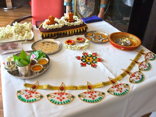 会場の一画には、ディワリの際のプージャー(儀礼)で用いられる道具なども展示されていました。何はともあれ、まずは象の神様「ガネーシャ」に祈りを捧げます。