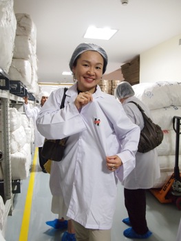 さて、食事のあとは、お待ちかねの工場見学。白衣を着用し、キャップを被り、靴にもカヴァーをかけて、準備を整えます。