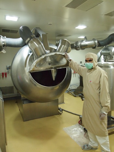 こちらは錠剤をコーティングしているところ。ザアザアと、かなり大きな音を立てながらドラムが回転しています。