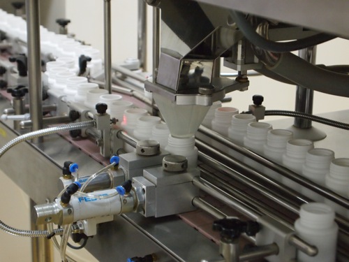 でき上がった錠剤を容器に詰めているところ。このあたりはすべて機械が作業しているようですが……。