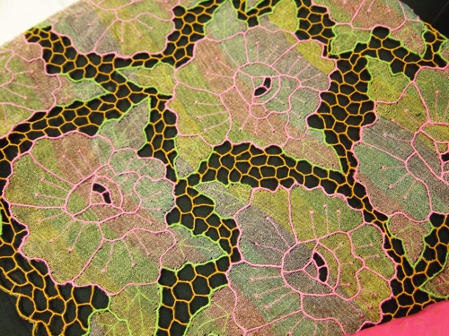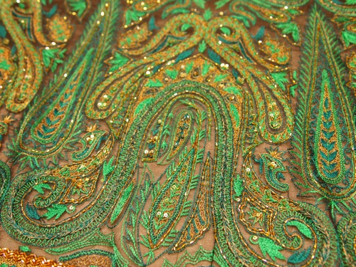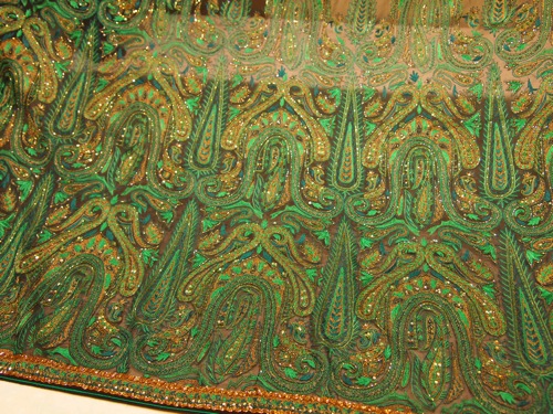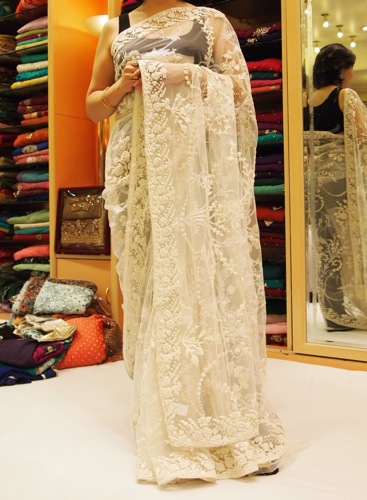 とはいえ、「手刺繍のものを」「高品質の上品なものを」と店の人に主張したら、奥の間へ連れて行ってくれて、こんな精緻な手仕事のサリーを見せてくれました。