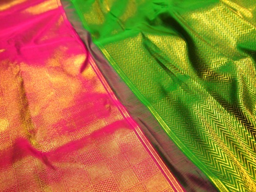 無数のサリーを見て来た「サリー歴5年」のプチ先輩からみても、そのサリーはとても素敵な色合いで、日本の着物的な繊細さもあり、クオリティに比して値段もお手頃。