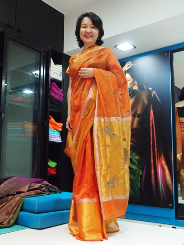 オレンジとゴールドのコンビネーションが鮮やかに、光のあたる角度によって光沢が変わるサリー。刺繍のワークも非常に丁寧で、これまた素敵なサリーでした。