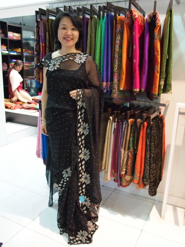 彼女に似合いそうなサリーも見つけました。いきなり自分で試着し、鏡に向かって「自己撮影」してみたりして、すでに気分が盛り上がっています。