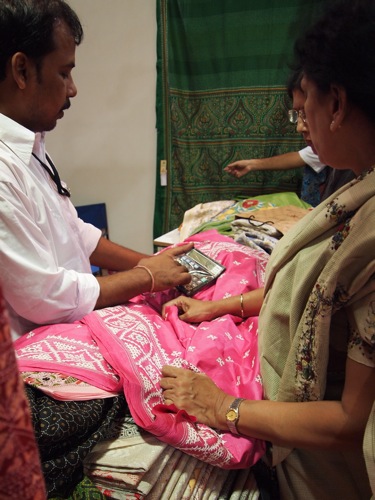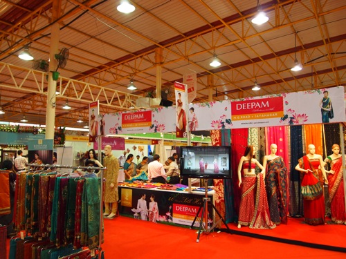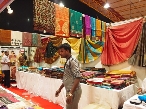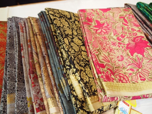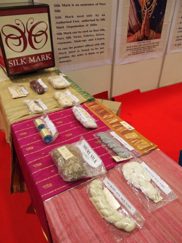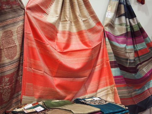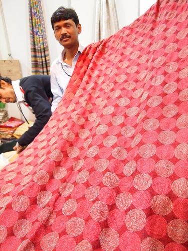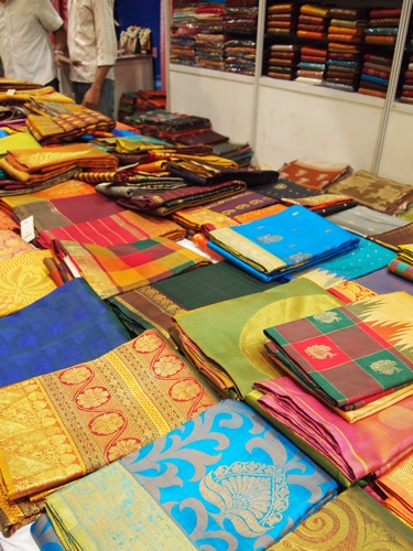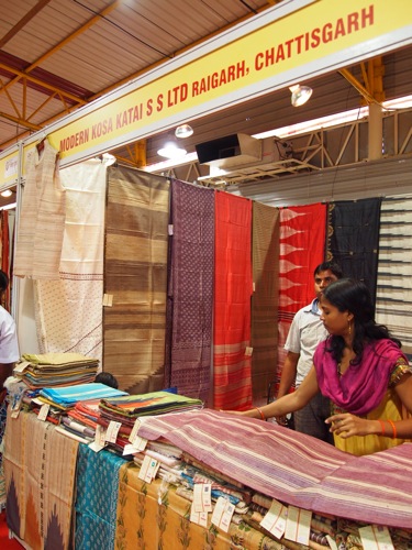 さて、いよいよインド各地の絹製品に触れ合うべく、中へ入ります。初日の早い時間とあってまだ人は少なめですが、その分、ゆっくりと見られそうでうれしいです。
