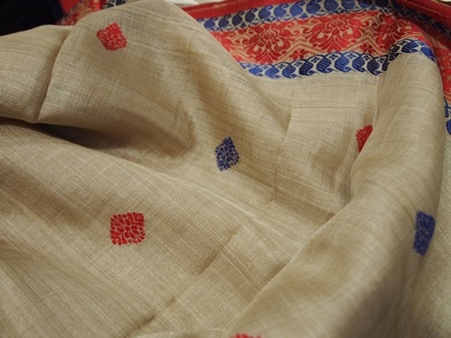 これは、昨日ご紹介した黄金色の絹糸、ムガ・シルクで織られたサリー。