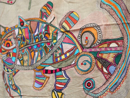 おっとこちらはまたアーティスティックな作品! これはコルカタの業者。カンタ刺繍風だけれど、独自世界が構築されています。