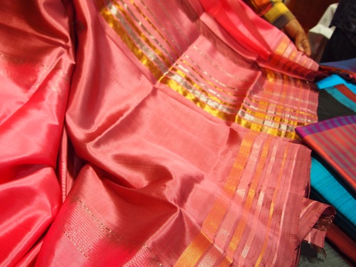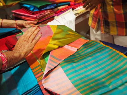 こちらのサリー店。シンプルな織りながら、上品な光沢のサリーがたくさん。この「マルチカラー」なサリー。