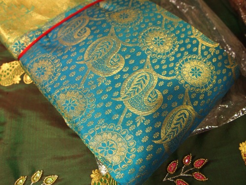 前回訪れたカシミール地方の刺繍の店。先日はまだ開封されていなかった荷物のなかにあったらしき、サリーのマテリアル。