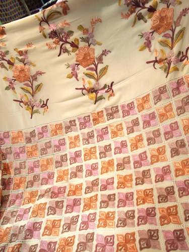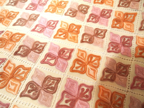 なんとなく、昭和の刺繍編みを思い出させる、懐かしいパターンです。もちろんすべてが手刺繍。丹念に作られています。
