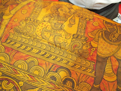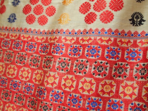 こちらはアッサム織りの典型的なデザイン。タッサーシルクが用いられています。赤、青、黄、緑、黒などの、くっきりとした原色が好んで使われるようです。