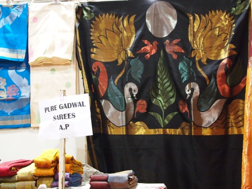 このサリー。お隣アンドラ・プラデシュ州はガドゥワル (GADWAL) の織物。パルーの部分に満月、白鳥、蓮華など、大胆な柄が個性的です。