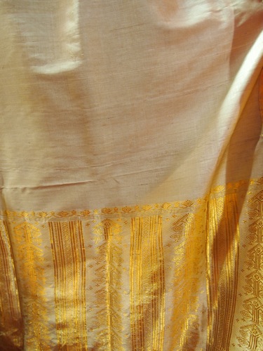こちらはアッサムの織物。グレイの地に艶やかな黄金色の糸が浮かび上がり、これもまた美しい一枚。